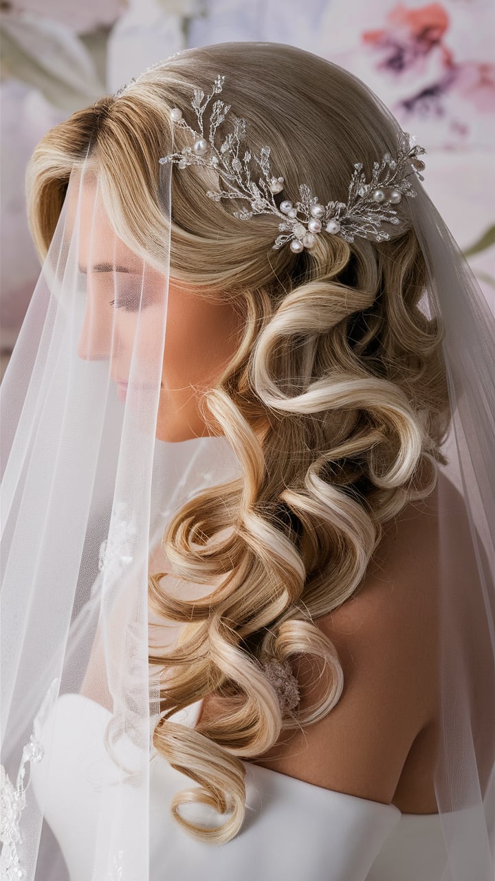Old Hollywood waves paired with a delicate floral comb behind the ear create timeless glam. Opt for dried flowers or silk petals in the comb for longevity.